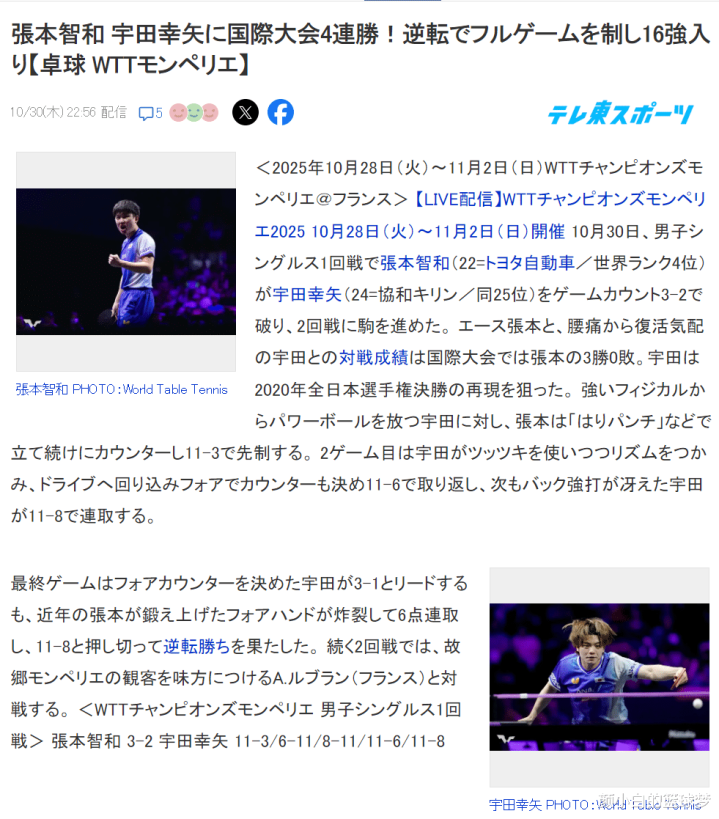 赛后日本媒体《东京体育新闻》专门报道了这场日乒内战,文中写道:22岁的世界排名第四3-2逆转了24岁的世界排名24,这场比赛张本智和选手险些就被宇田幸矢选手击败,宇田幸矢选手差一点就复刻了2020年全日本金标赛决赛击败王牌张本选手,此役后宇田选手在国际赛场与张本选手的交手战绩改为为0胜4负。