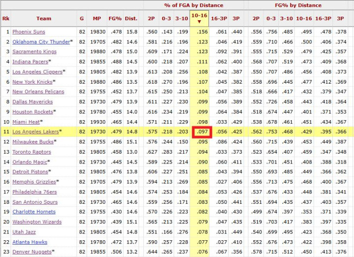24-25季湖人整体中投出手占比9.7%,虽然不像太阳那样占比超过15%(15.6%),但接近10%的占比说明中距离也是紫金军团主要终结方式之一。