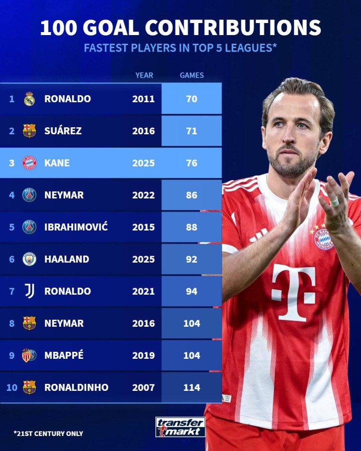 虎扑12月09日讯德国转会市场统计了本世纪五大联赛球员在单一联赛参与100球所用的比赛场次,并排出了用时最短的前十名球员: