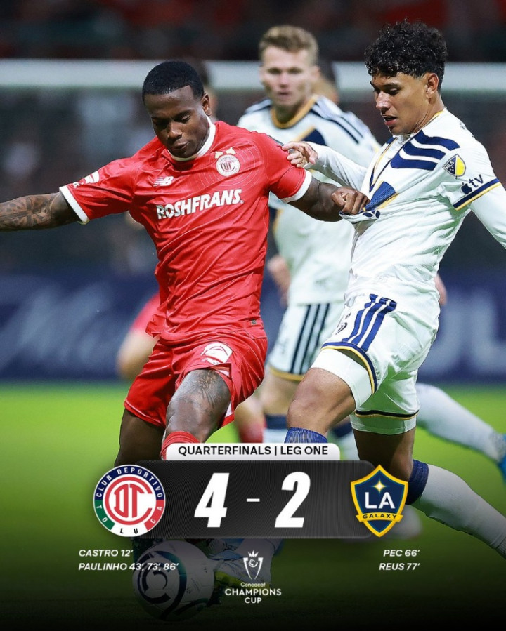 直播吧4月9日讯中北美冠军杯1/4决赛首回合比赛,洛杉矶银河客场2-4不敌托卢卡。